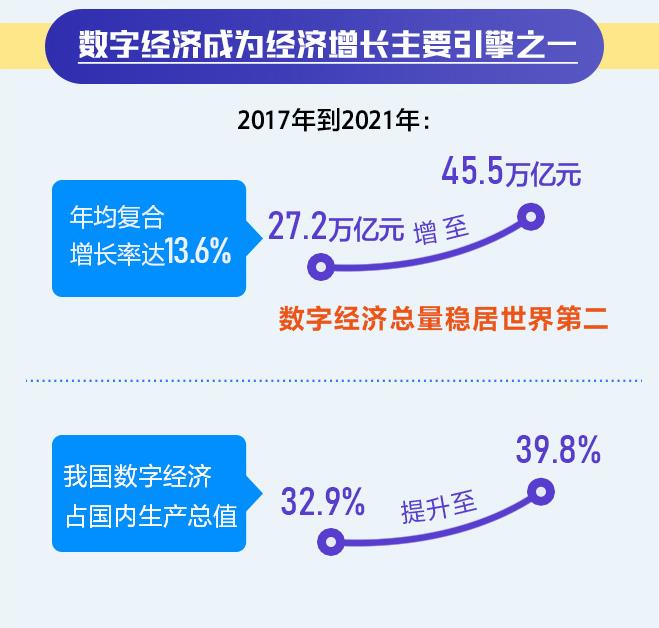 《報(bào)告》顯示,2017年到2021年,我國(guó)數(shù)字經(jīng)濟(jì)規(guī)模從27.2萬億增至45.5萬億元,總量穩(wěn)居世界第二,年均復(fù)合增長(zhǎng)率達(dá)13.6%,占國(guó)內(nèi)生產(chǎn)總值比重從32.9%提升至39.8%,成為推動(dòng)經(jīng)濟(jì)增長(zhǎng)的主要引擎之一。