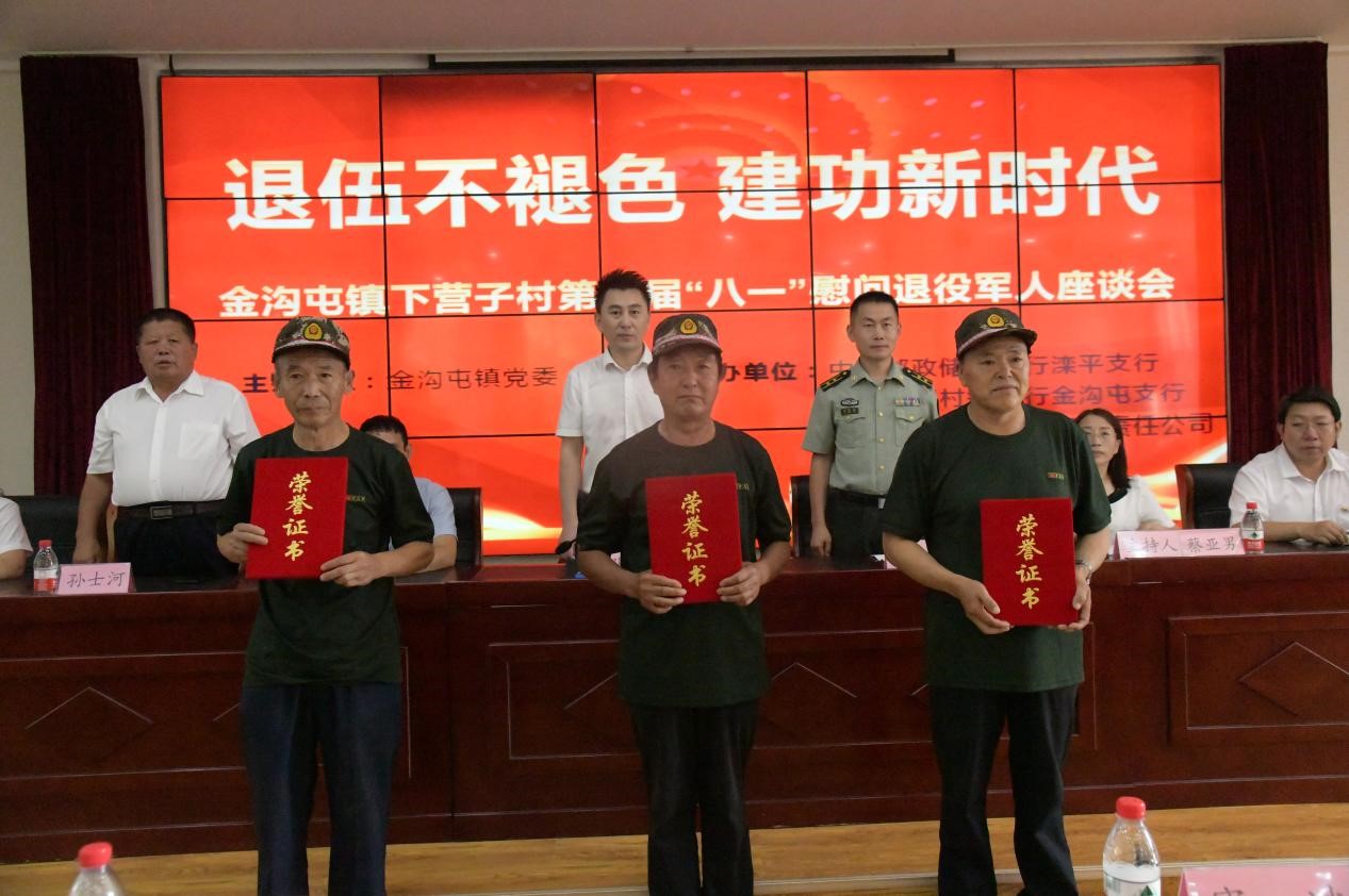 8月1日下午,灤平縣金溝屯鎮(zhèn)下營子村聯(lián)合愛心企業(yè)中國郵政儲蓄銀行灤平支行、灤平盛陽村鎮(zhèn)銀行金溝屯支行和承德久財農(nóng)牧開發(fā)有限責(zé)任公司共同舉辦了“退伍不褪色 建功新時代”第二屆“八一”慰問退役軍人座談會;顒蝇F(xiàn)場,大家歡聚一堂,共同慶祝中國人民解放軍建軍95周年,共敘魚水深情,并為優(yōu)秀退役軍人頒發(fā)榮譽(yù)證書。 王海琦 郎朗 攝
