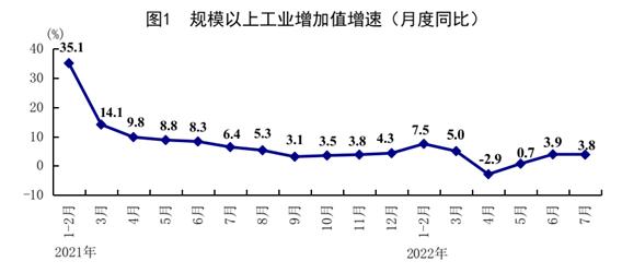 看工業(yè)。7月份,全國規(guī)模以上工業(yè)增加值同比增長3.8%,比上月回落0.1個百分點(diǎn);環(huán)比增長0.38%。