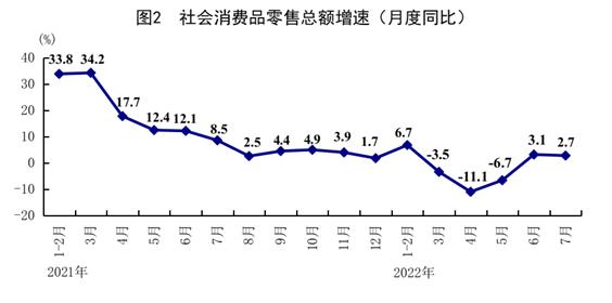 看消費(fèi)。7月份,社會消費(fèi)品零售總額同比增長2.7%,增速比上月回落0.4個百分點(diǎn)。